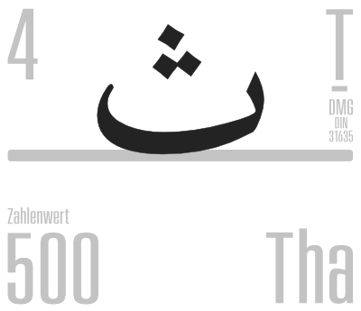 4. Das ث (Tha) ist der vierte von 28 arabischen Buchstaben im Abjad-Schriftsystem, die Konsonantenschirft der Lesung (Koran). Im traditionell-klassischen Abjad-Zahlensystem wird dem Buchstaben ث (Tha) der Zahlenwert 500 zugeordet. Das arabische Alphabet ist die Schrift, in der der Koran verfasst ist. [1] [2]